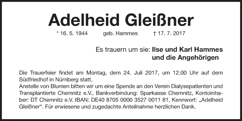 Hier finden Sie alle Traueranzeigen aus der Zeitung, die bisher für Adelheid Gleißner erschienen sind. Weitere Traueranzeigen, die in der Zeitung erscheinen, werden hier ebenfalls aufgelistet