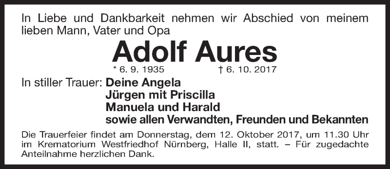 Hier finden Sie alle Traueranzeigen aus der Zeitung, die bisher für Adolf Aures erschienen sind. Weitere Traueranzeigen, die in der Zeitung erscheinen, werden hier ebenfalls aufgelistet