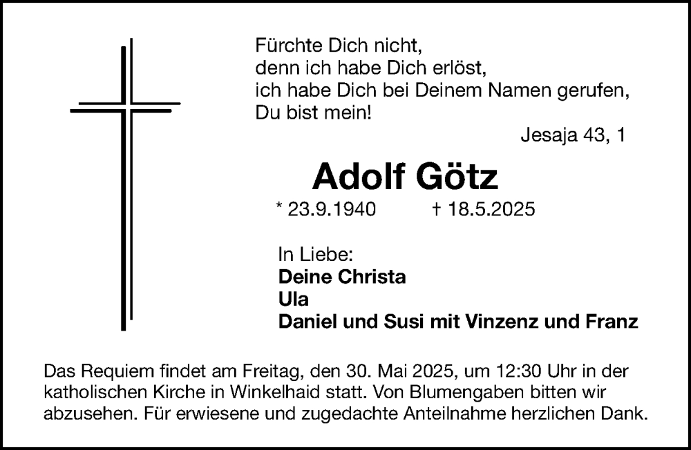 Hier finden Sie alle Traueranzeigen aus der Zeitung, die bisher für Adolf Götz erschienen sind. Weitere Traueranzeigen, die in der Zeitung erscheinen, werden hier ebenfalls aufgelistet