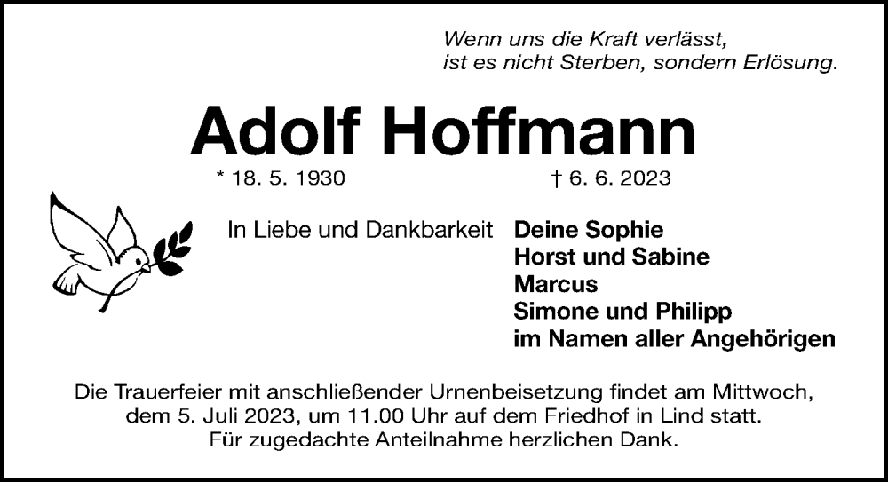 Hier finden Sie alle Traueranzeigen aus der Zeitung, die bisher für Adolf Hoffmann erschienen sind. Weitere Traueranzeigen, die in der Zeitung erscheinen, werden hier ebenfalls aufgelistet