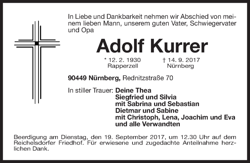Hier finden Sie alle Traueranzeigen aus der Zeitung, die bisher für Adolf Kurrer erschienen sind. Weitere Traueranzeigen, die in der Zeitung erscheinen, werden hier ebenfalls aufgelistet