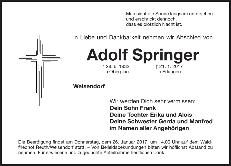 Hier finden Sie alle Traueranzeigen aus der Zeitung, die bisher für Adolf Springer erschienen sind. Weitere Traueranzeigen, die in der Zeitung erscheinen, werden hier ebenfalls aufgelistet