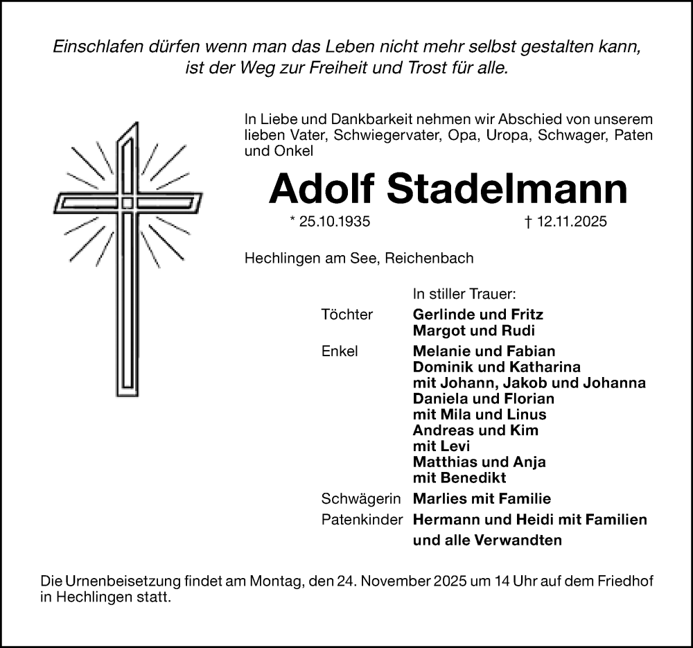 Hier finden Sie alle Traueranzeigen aus der Zeitung, die bisher für Adolf Stadelmann erschienen sind. Weitere Traueranzeigen, die in der Zeitung erscheinen, werden hier ebenfalls aufgelistet