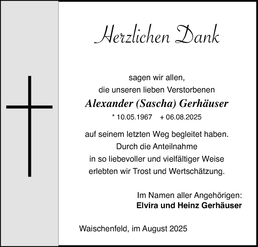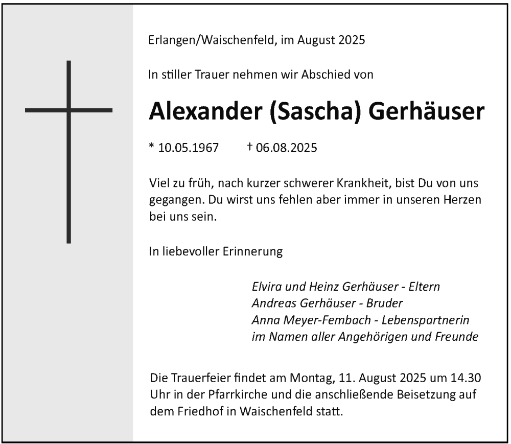 Hier finden Sie alle Traueranzeigen aus der Zeitung, die bisher für Alexander Gerhäuser erschienen sind. Weitere Traueranzeigen, die in der Zeitung erscheinen, werden hier ebenfalls aufgelistet