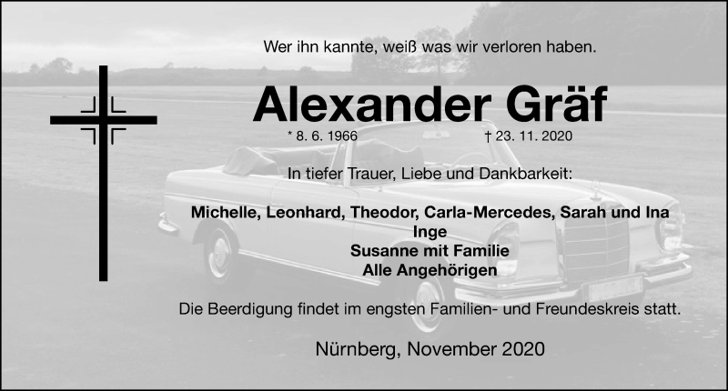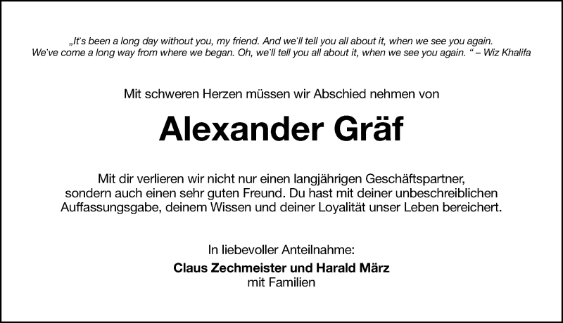 Hier finden Sie alle Traueranzeigen aus der Zeitung, die bisher für Alexander Gräf erschienen sind. Weitere Traueranzeigen, die in der Zeitung erscheinen, werden hier ebenfalls aufgelistet