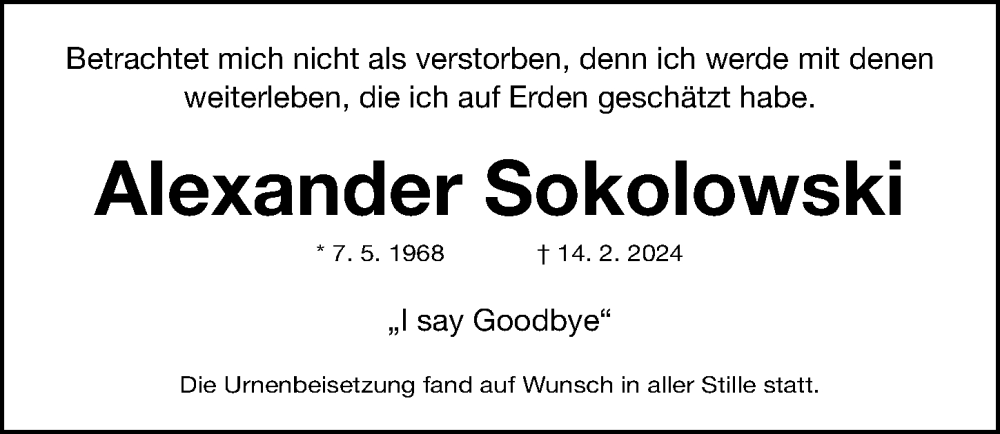 Hier finden Sie alle Traueranzeigen aus der Zeitung, die bisher für Alexander Sokolowski erschienen sind. Weitere Traueranzeigen, die in der Zeitung erscheinen, werden hier ebenfalls aufgelistet
