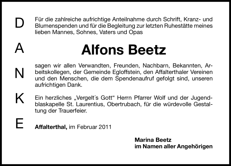 Hier finden Sie alle Traueranzeigen aus der Zeitung, die bisher für Alfons Beetz erschienen sind. Weitere Traueranzeigen, die in der Zeitung erscheinen, werden hier ebenfalls aufgelistet