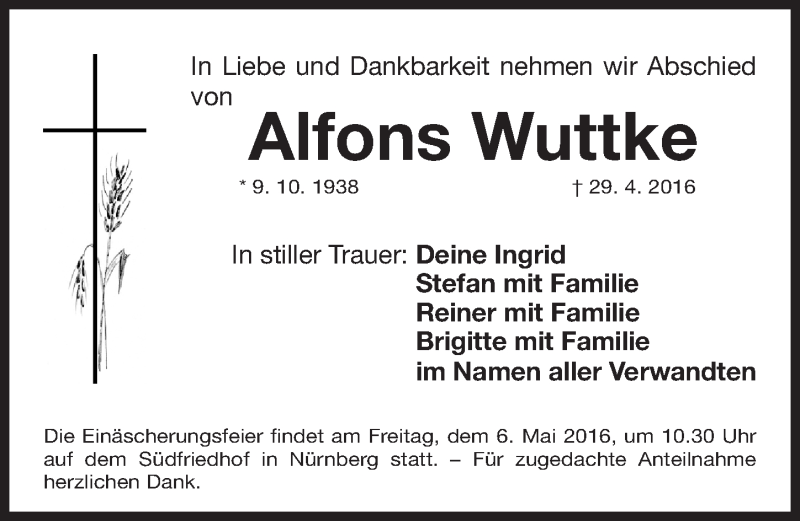 Hier finden Sie alle Traueranzeigen aus der Zeitung, die bisher für Alfons Wuttke erschienen sind. Weitere Traueranzeigen, die in der Zeitung erscheinen, werden hier ebenfalls aufgelistet