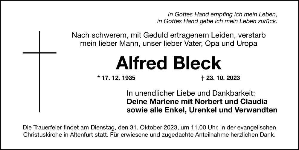 Hier finden Sie alle Traueranzeigen aus der Zeitung, die bisher für Alfred Bleck erschienen sind. Weitere Traueranzeigen, die in der Zeitung erscheinen, werden hier ebenfalls aufgelistet