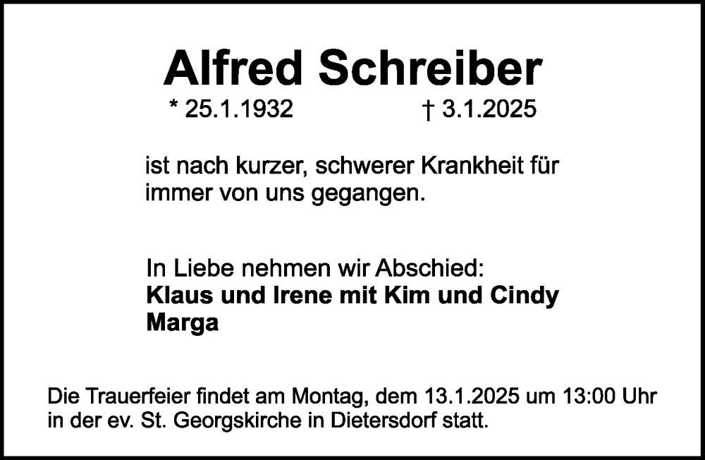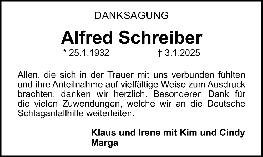 Hier finden Sie alle Traueranzeigen aus der Zeitung, die bisher für Alfred Schreiber erschienen sind. Weitere Traueranzeigen, die in der Zeitung erscheinen, werden hier ebenfalls aufgelistet