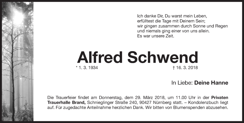 Hier finden Sie alle Traueranzeigen aus der Zeitung, die bisher für Alfred Schwend erschienen sind. Weitere Traueranzeigen, die in der Zeitung erscheinen, werden hier ebenfalls aufgelistet