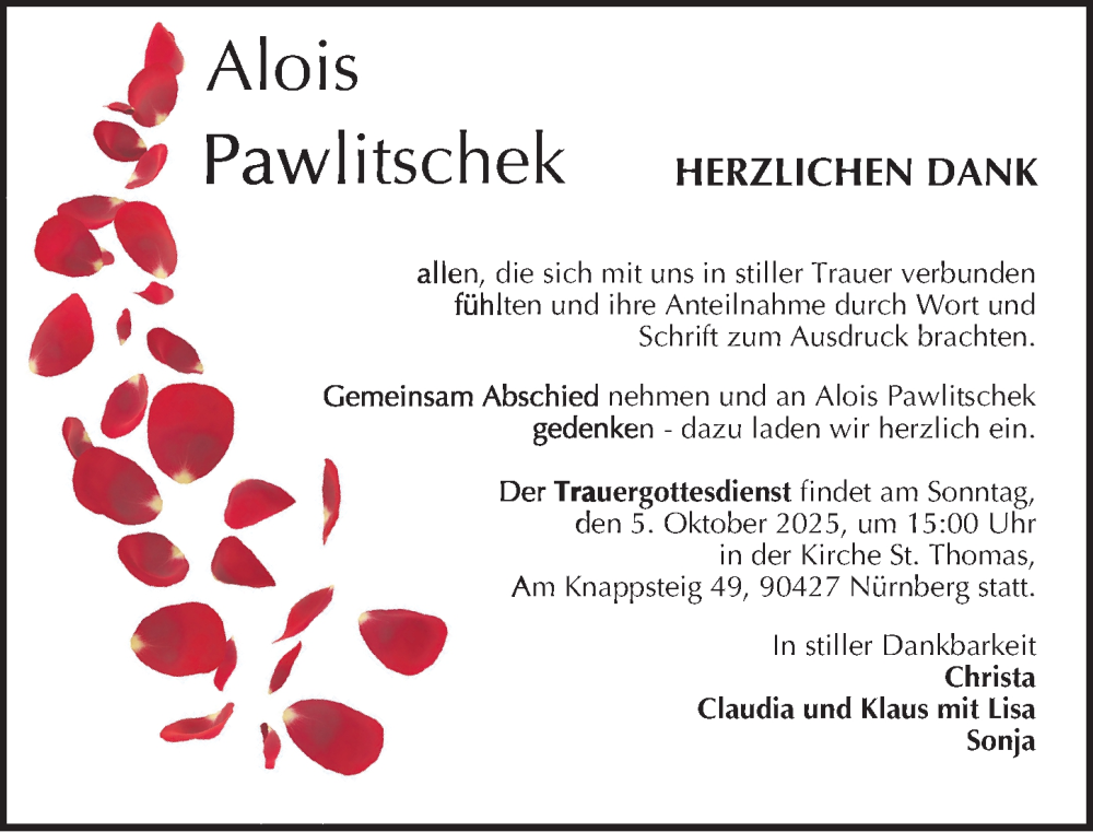 Hier finden Sie alle Traueranzeigen aus der Zeitung, die bisher für Alois Pawlitschek erschienen sind. Weitere Traueranzeigen, die in der Zeitung erscheinen, werden hier ebenfalls aufgelistet