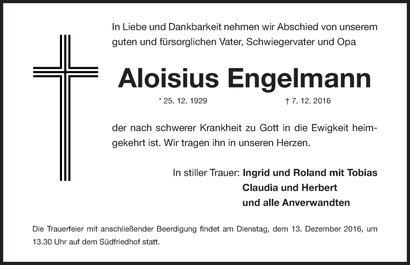 Hier finden Sie alle Traueranzeigen aus der Zeitung, die bisher für Aloisius Engelmann erschienen sind. Weitere Traueranzeigen, die in der Zeitung erscheinen, werden hier ebenfalls aufgelistet