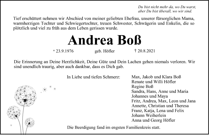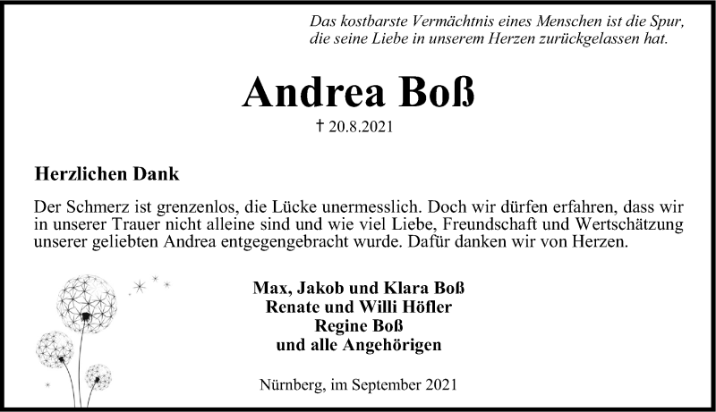 Hier finden Sie alle Traueranzeigen aus der Zeitung, die bisher für Andrea Boß erschienen sind. Weitere Traueranzeigen, die in der Zeitung erscheinen, werden hier ebenfalls aufgelistet