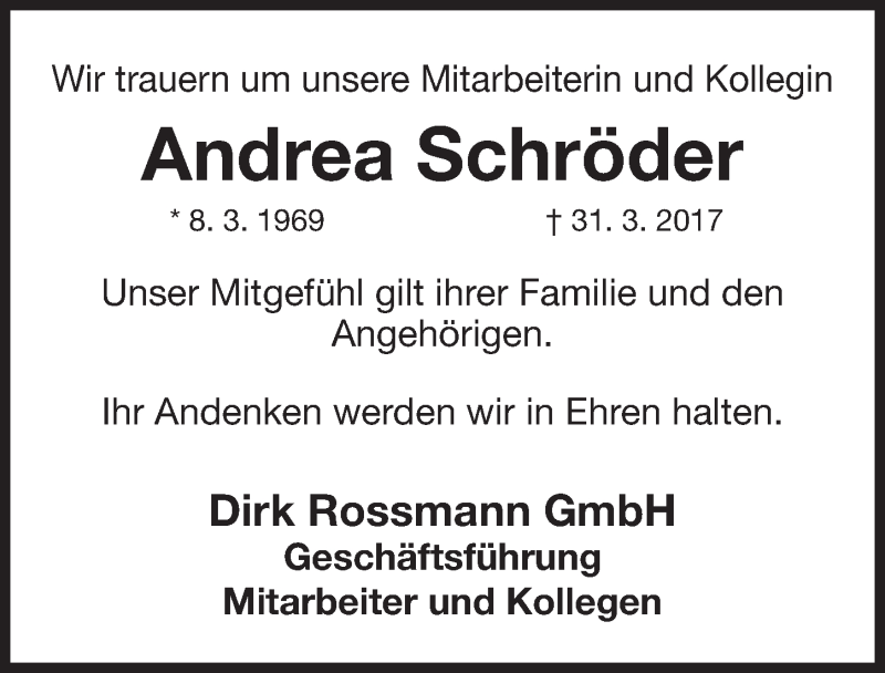 Hier finden Sie alle Traueranzeigen aus der Zeitung, die bisher für Andrea Schröder erschienen sind. Weitere Traueranzeigen, die in der Zeitung erscheinen, werden hier ebenfalls aufgelistet