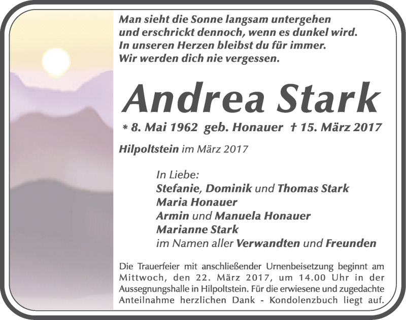 Hier finden Sie alle Traueranzeigen aus der Zeitung, die bisher für Andrea Stark erschienen sind. Weitere Traueranzeigen, die in der Zeitung erscheinen, werden hier ebenfalls aufgelistet