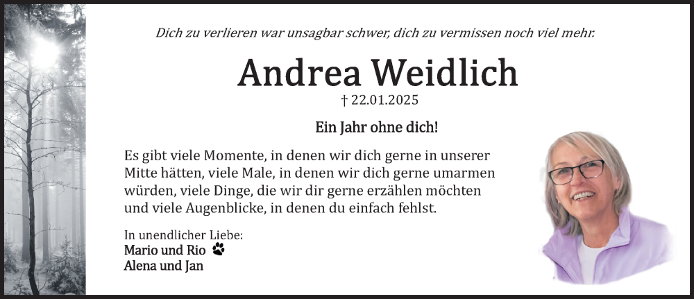 Hier finden Sie alle Traueranzeigen aus der Zeitung, die bisher für Andrea Weidlich erschienen sind. Weitere Traueranzeigen, die in der Zeitung erscheinen, werden hier ebenfalls aufgelistet