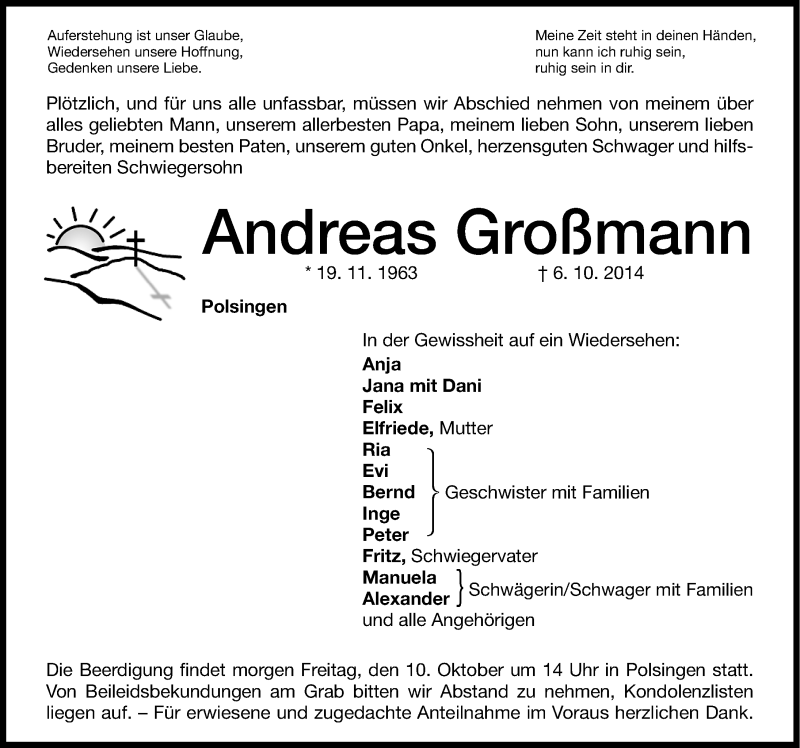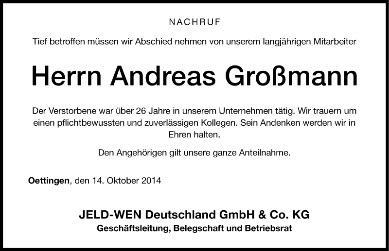 Hier finden Sie alle Traueranzeigen aus der Zeitung, die bisher für Andreas Großmann erschienen sind. Weitere Traueranzeigen, die in der Zeitung erscheinen, werden hier ebenfalls aufgelistet