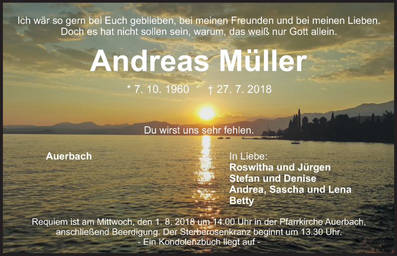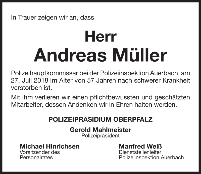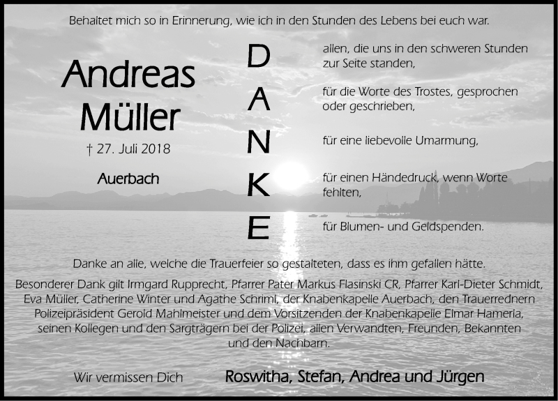 Hier finden Sie alle Traueranzeigen aus der Zeitung, die bisher für Andreas Müller erschienen sind. Weitere Traueranzeigen, die in der Zeitung erscheinen, werden hier ebenfalls aufgelistet