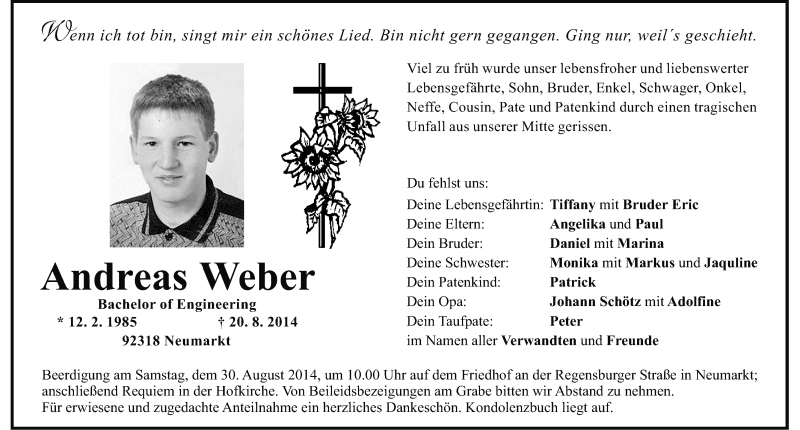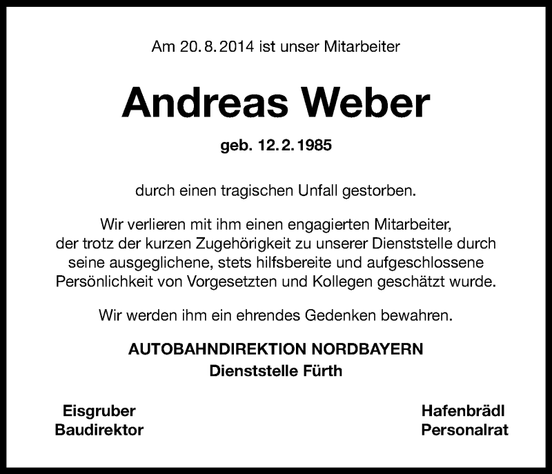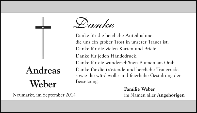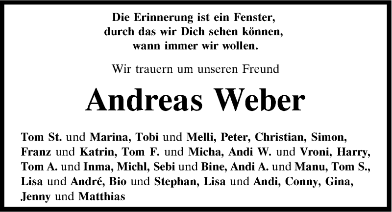 Hier finden Sie alle Traueranzeigen aus der Zeitung, die bisher für Andreas Weber erschienen sind. Weitere Traueranzeigen, die in der Zeitung erscheinen, werden hier ebenfalls aufgelistet