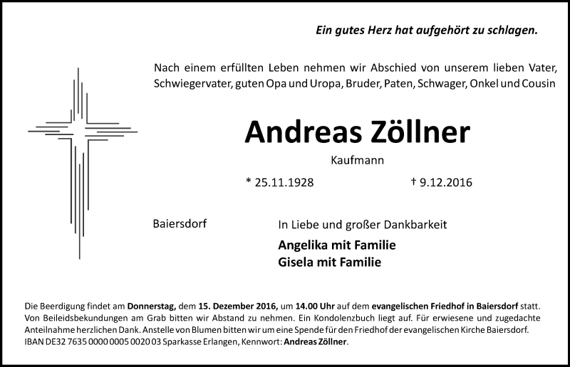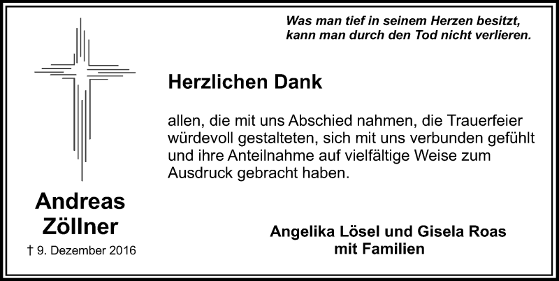 Hier finden Sie alle Traueranzeigen aus der Zeitung, die bisher für Andreas Zöllner erschienen sind. Weitere Traueranzeigen, die in der Zeitung erscheinen, werden hier ebenfalls aufgelistet