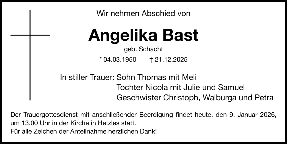 Hier finden Sie alle Traueranzeigen aus der Zeitung, die bisher für Angelika Bast erschienen sind. Weitere Traueranzeigen, die in der Zeitung erscheinen, werden hier ebenfalls aufgelistet