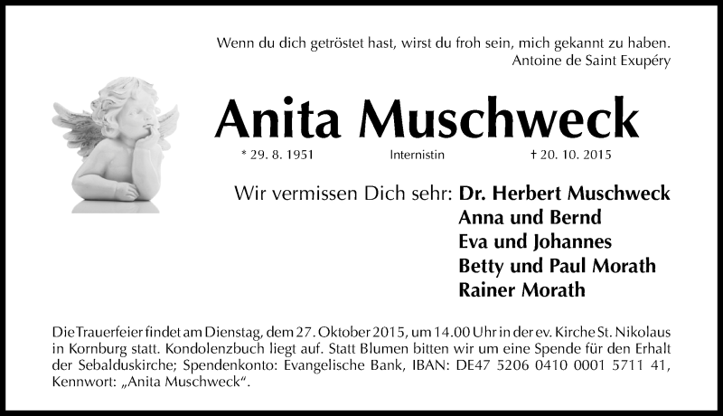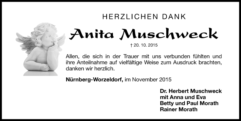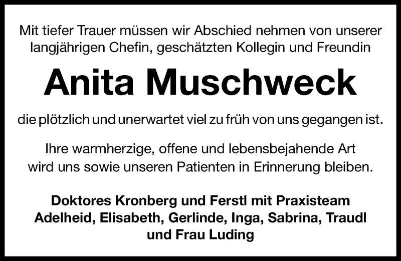 Hier finden Sie alle Traueranzeigen aus der Zeitung, die bisher für Anita Muschweck erschienen sind. Weitere Traueranzeigen, die in der Zeitung erscheinen, werden hier ebenfalls aufgelistet