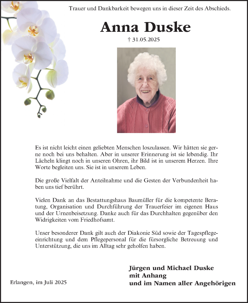 Hier finden Sie alle Traueranzeigen aus der Zeitung, die bisher für Anna Duske erschienen sind. Weitere Traueranzeigen, die in der Zeitung erscheinen, werden hier ebenfalls aufgelistet