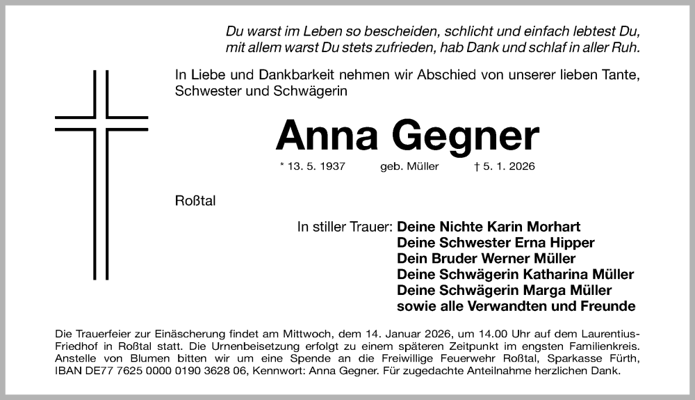 Hier finden Sie alle Traueranzeigen aus der Zeitung, die bisher für Anna Gegner erschienen sind. Weitere Traueranzeigen, die in der Zeitung erscheinen, werden hier ebenfalls aufgelistet