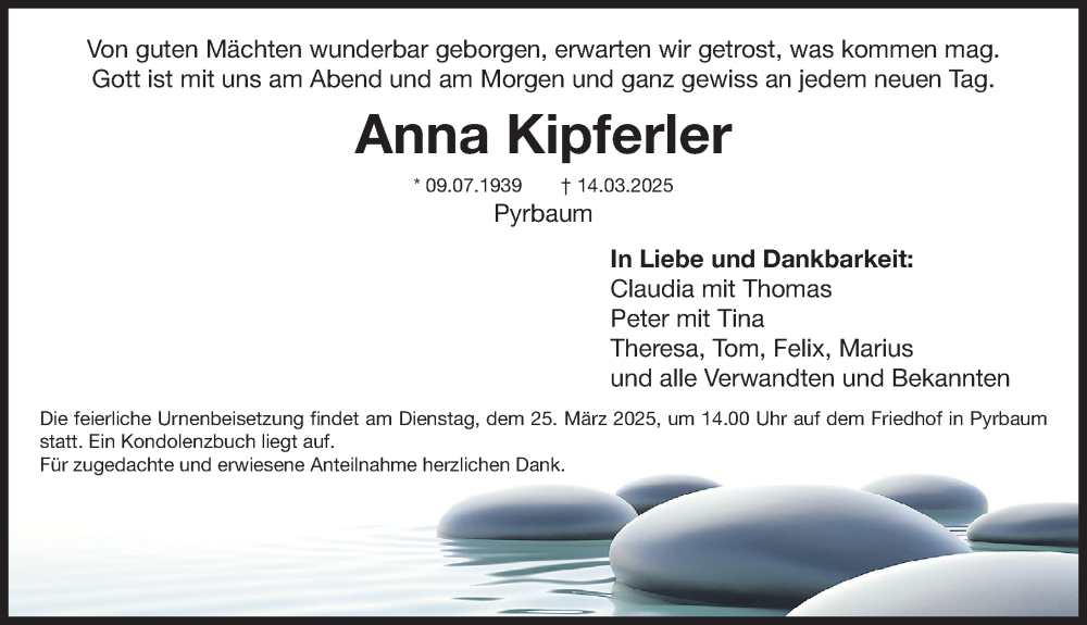 Hier finden Sie alle Traueranzeigen aus der Zeitung, die bisher für Anna Kipferler erschienen sind. Weitere Traueranzeigen, die in der Zeitung erscheinen, werden hier ebenfalls aufgelistet