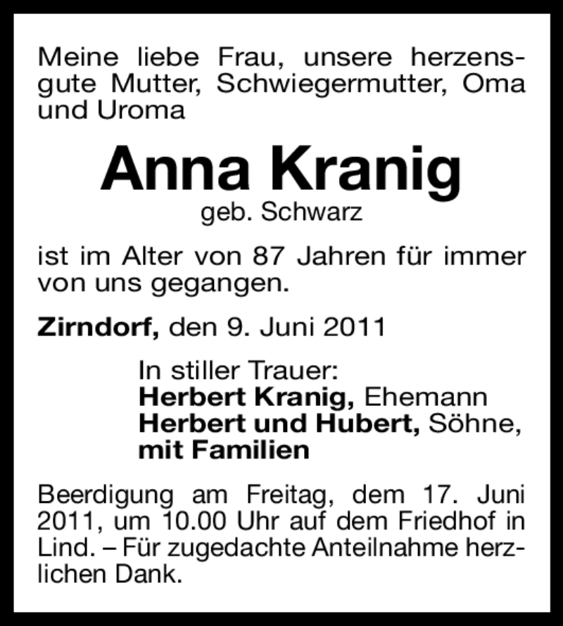 Hier finden Sie alle Traueranzeigen aus der Zeitung, die bisher für Anna Kranig erschienen sind. Weitere Traueranzeigen, die in der Zeitung erscheinen, werden hier ebenfalls aufgelistet