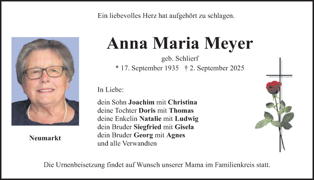 Hier finden Sie alle Traueranzeigen aus der Zeitung, die bisher für Anna Maria Meyer erschienen sind. Weitere Traueranzeigen, die in der Zeitung erscheinen, werden hier ebenfalls aufgelistet