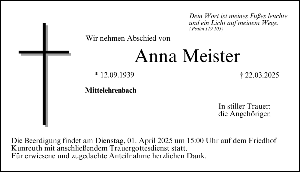 Hier finden Sie alle Traueranzeigen aus der Zeitung, die bisher für Anna Meister erschienen sind. Weitere Traueranzeigen, die in der Zeitung erscheinen, werden hier ebenfalls aufgelistet