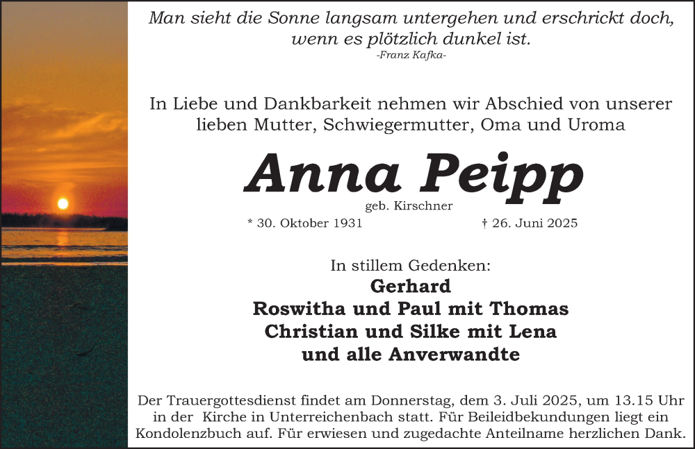 Hier finden Sie alle Traueranzeigen aus der Zeitung, die bisher für Anna Peipp erschienen sind. Weitere Traueranzeigen, die in der Zeitung erscheinen, werden hier ebenfalls aufgelistet