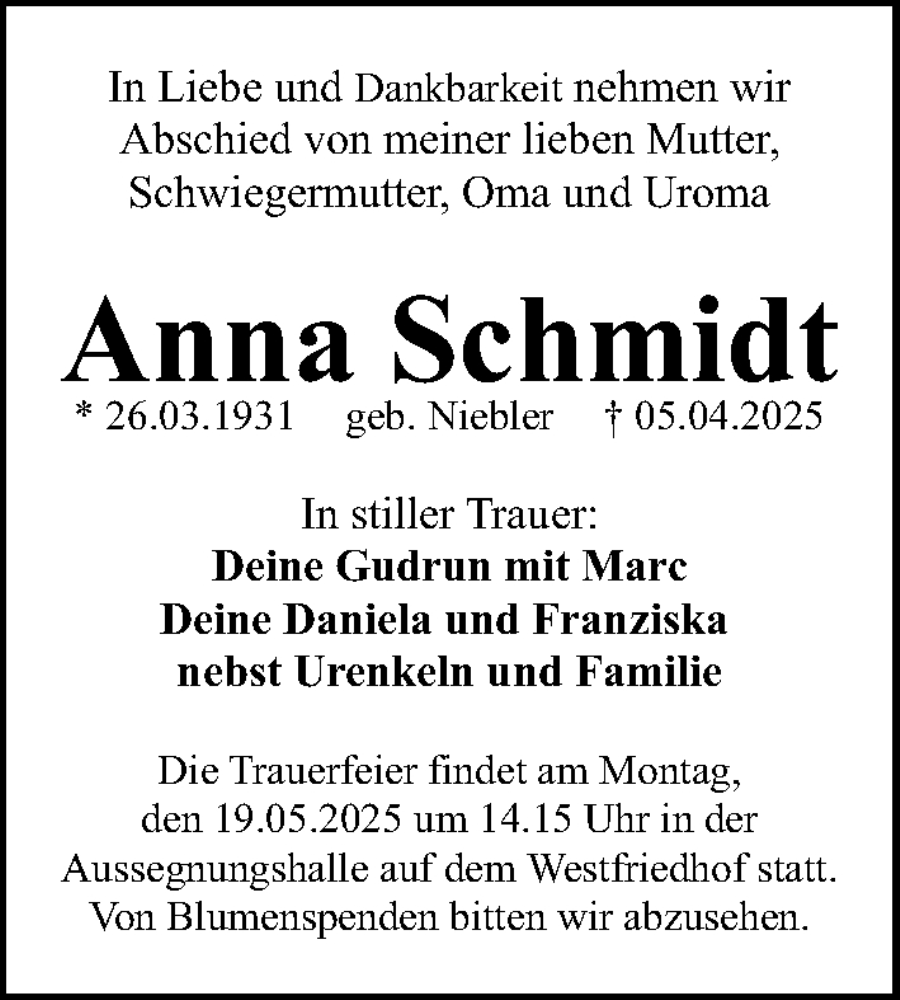 Hier finden Sie alle Traueranzeigen aus der Zeitung, die bisher für Anna Schmidt erschienen sind. Weitere Traueranzeigen, die in der Zeitung erscheinen, werden hier ebenfalls aufgelistet