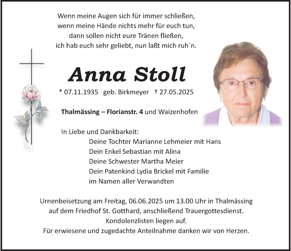 Hier finden Sie alle Traueranzeigen aus der Zeitung, die bisher für Anna Stoll erschienen sind. Weitere Traueranzeigen, die in der Zeitung erscheinen, werden hier ebenfalls aufgelistet