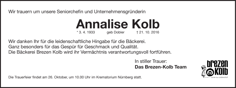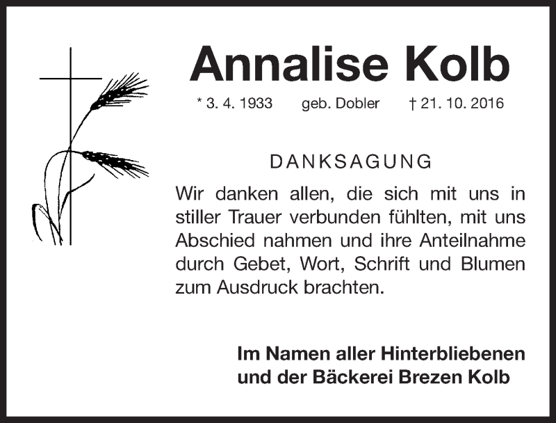 Hier finden Sie alle Traueranzeigen aus der Zeitung, die bisher für Annalise Kolb erschienen sind. Weitere Traueranzeigen, die in der Zeitung erscheinen, werden hier ebenfalls aufgelistet
