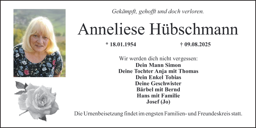 Hier finden Sie alle Traueranzeigen aus der Zeitung, die bisher für Anneliese Hübschmann erschienen sind. Weitere Traueranzeigen, die in der Zeitung erscheinen, werden hier ebenfalls aufgelistet