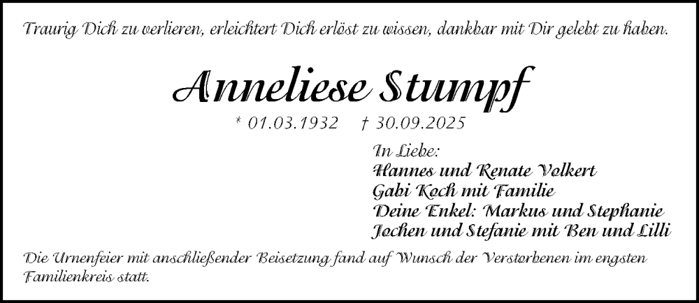 Hier finden Sie alle Traueranzeigen aus der Zeitung, die bisher für Anneliese Stumpf erschienen sind. Weitere Traueranzeigen, die in der Zeitung erscheinen, werden hier ebenfalls aufgelistet