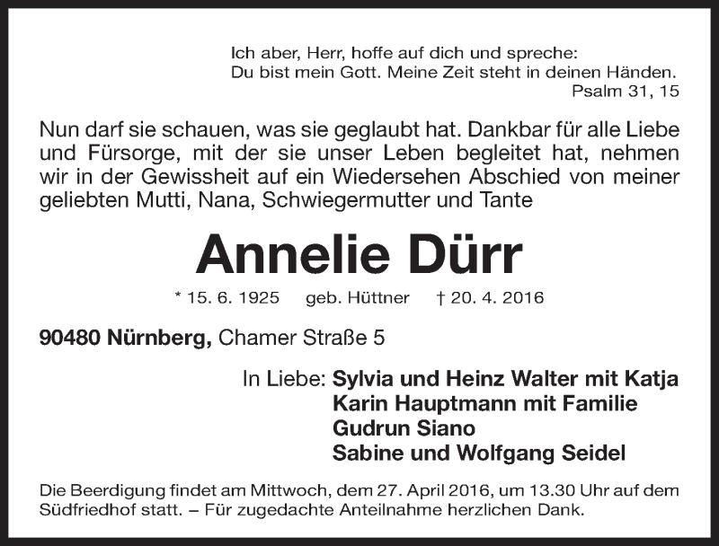 Hier finden Sie alle Traueranzeigen aus der Zeitung, die bisher für Annelle Dürr erschienen sind. Weitere Traueranzeigen, die in der Zeitung erscheinen, werden hier ebenfalls aufgelistet