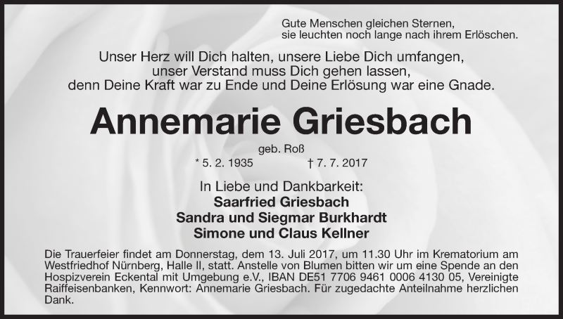 Hier finden Sie alle Traueranzeigen aus der Zeitung, die bisher für Annemarie Griesbach erschienen sind. Weitere Traueranzeigen, die in der Zeitung erscheinen, werden hier ebenfalls aufgelistet
