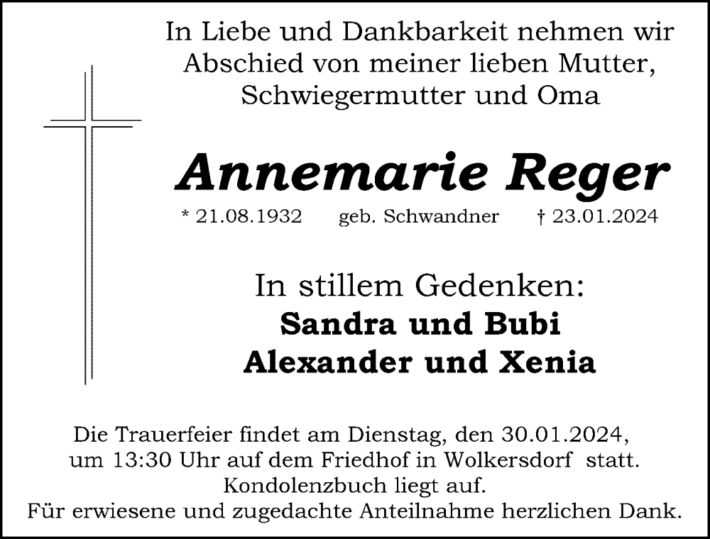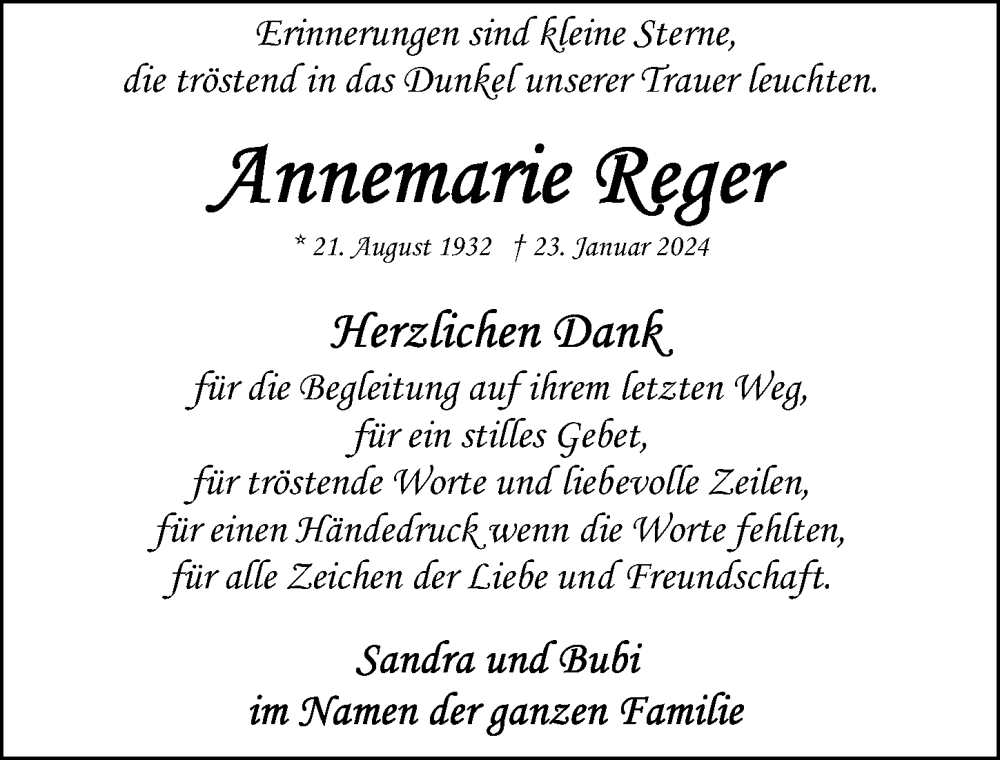 Hier finden Sie alle Traueranzeigen aus der Zeitung, die bisher für Annemarie Reger erschienen sind. Weitere Traueranzeigen, die in der Zeitung erscheinen, werden hier ebenfalls aufgelistet