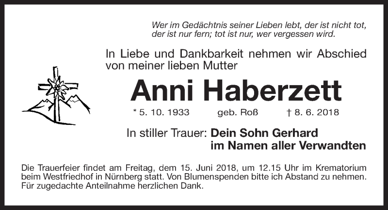 Hier finden Sie alle Traueranzeigen aus der Zeitung, die bisher für Anni Haberzett erschienen sind. Weitere Traueranzeigen, die in der Zeitung erscheinen, werden hier ebenfalls aufgelistet