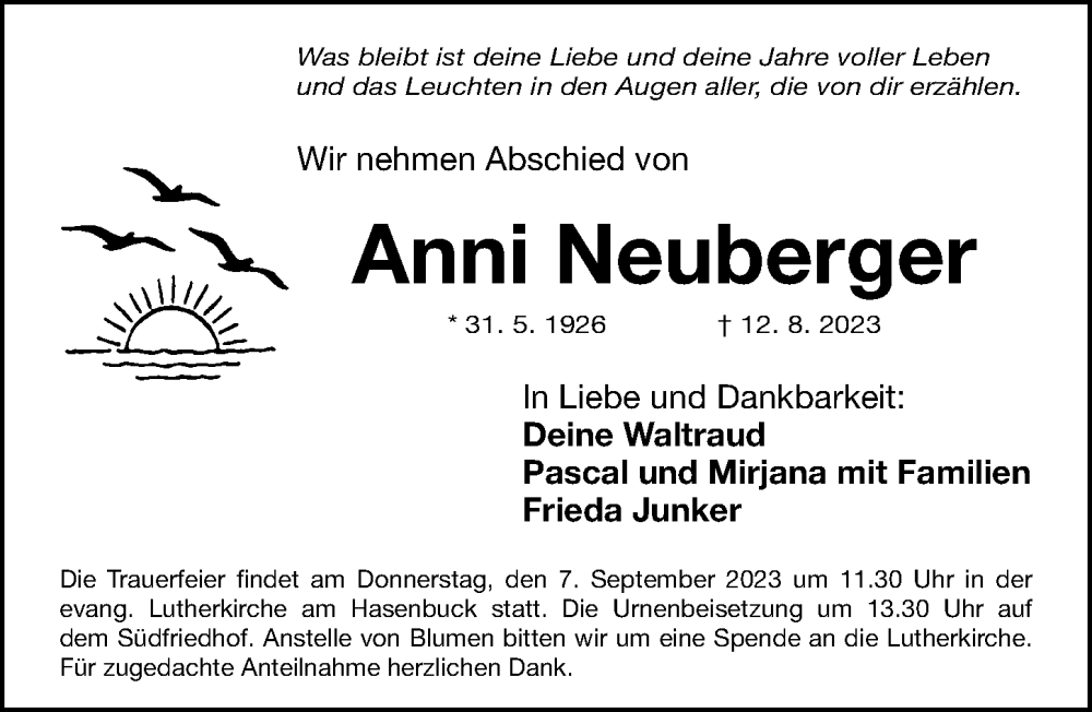 Hier finden Sie alle Traueranzeigen aus der Zeitung, die bisher für Anni Neuberger erschienen sind. Weitere Traueranzeigen, die in der Zeitung erscheinen, werden hier ebenfalls aufgelistet