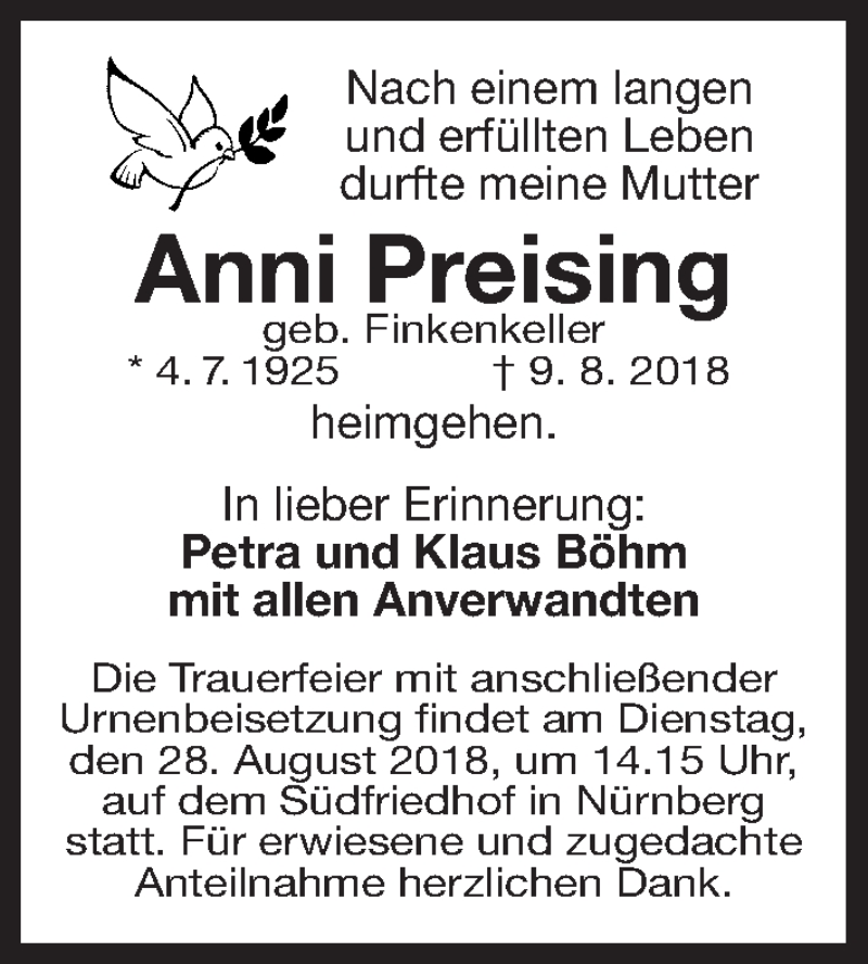 Hier finden Sie alle Traueranzeigen aus der Zeitung, die bisher für Anni Preising erschienen sind. Weitere Traueranzeigen, die in der Zeitung erscheinen, werden hier ebenfalls aufgelistet