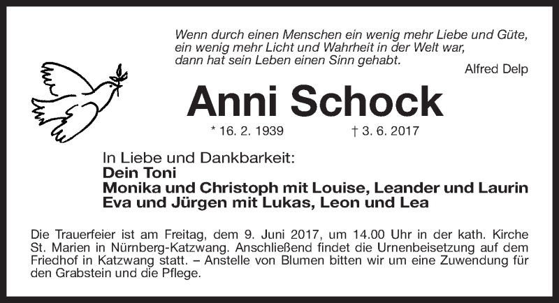 Hier finden Sie alle Traueranzeigen aus der Zeitung, die bisher für Anni Schock erschienen sind. Weitere Traueranzeigen, die in der Zeitung erscheinen, werden hier ebenfalls aufgelistet