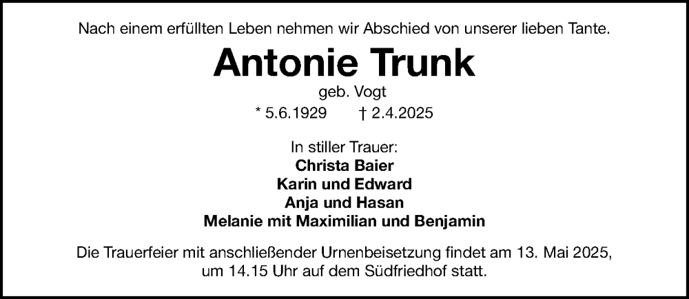 Hier finden Sie alle Traueranzeigen aus der Zeitung, die bisher für Antonie Trunk erschienen sind. Weitere Traueranzeigen, die in der Zeitung erscheinen, werden hier ebenfalls aufgelistet