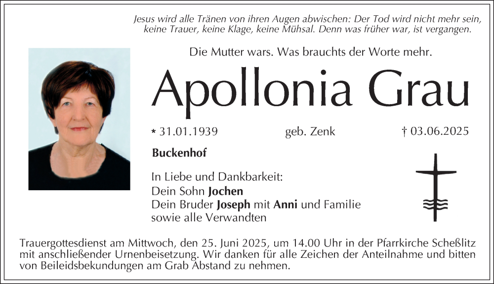 Hier finden Sie alle Traueranzeigen aus der Zeitung, die bisher für Apollonia Grau erschienen sind. Weitere Traueranzeigen, die in der Zeitung erscheinen, werden hier ebenfalls aufgelistet