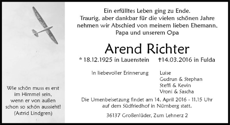 Hier finden Sie alle Traueranzeigen aus der Zeitung, die bisher für Arend Richter erschienen sind. Weitere Traueranzeigen, die in der Zeitung erscheinen, werden hier ebenfalls aufgelistet
