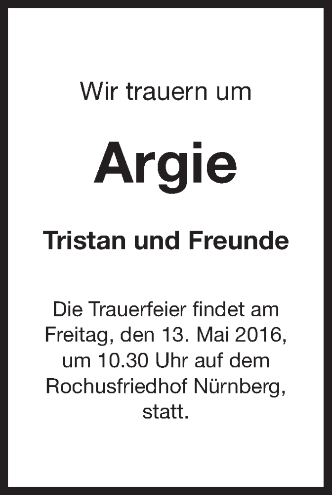 Hier finden Sie alle Traueranzeigen aus der Zeitung, die bisher für Argie erschienen sind. Weitere Traueranzeigen, die in der Zeitung erscheinen, werden hier ebenfalls aufgelistet